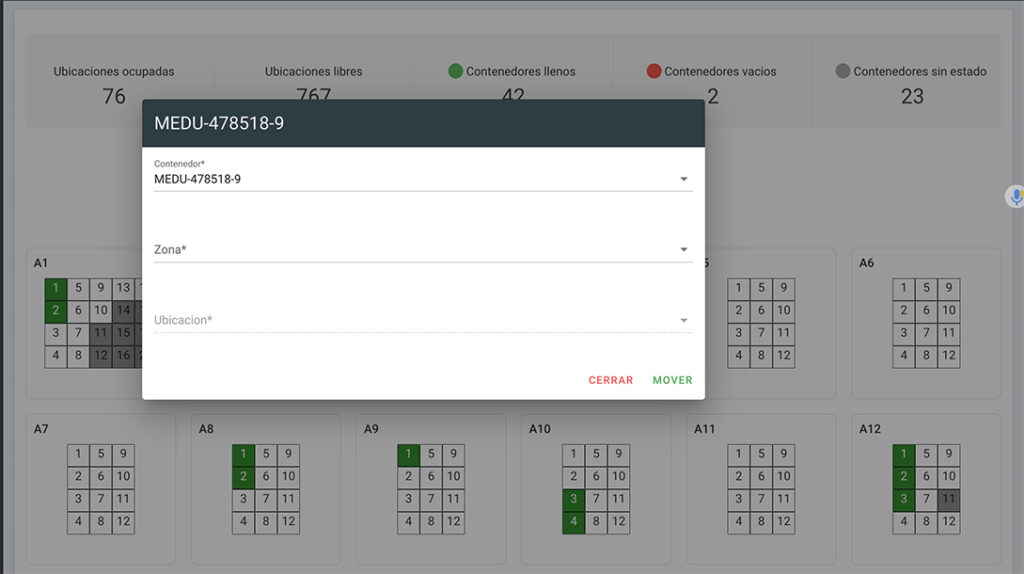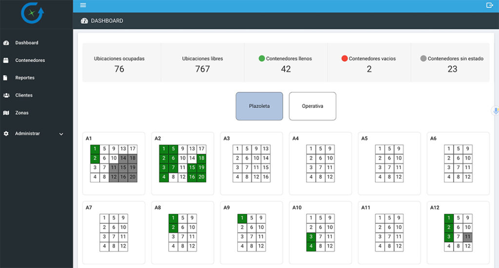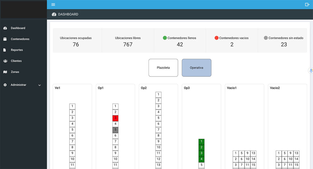 Podrás diseñarlo de acuerdo a tus necesidades de manera rápida y ágil. El dashboard del sistema te mostrará las ubicaciones ocupadas y libres, los contenedores llenos y vacíos, utilizando colores para su fácil visualización. Pasando el mousse sobre la grilla podrás ver la matricula de cualquier contenedor.