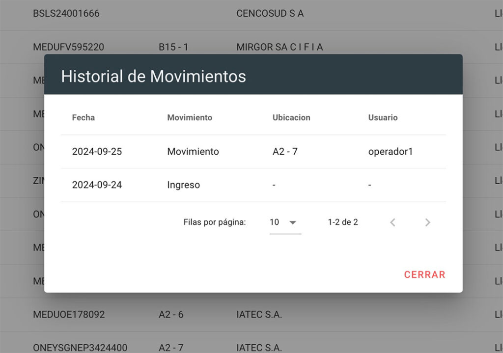El sistema cuenta con una pantalla que lista todos los contenedores, donde utilizando cualquiera de los múltiples filtros disponibles podrá buscar lo que necesite como asi mismo mover masivamente múltiples contenedores de una locación a otra.