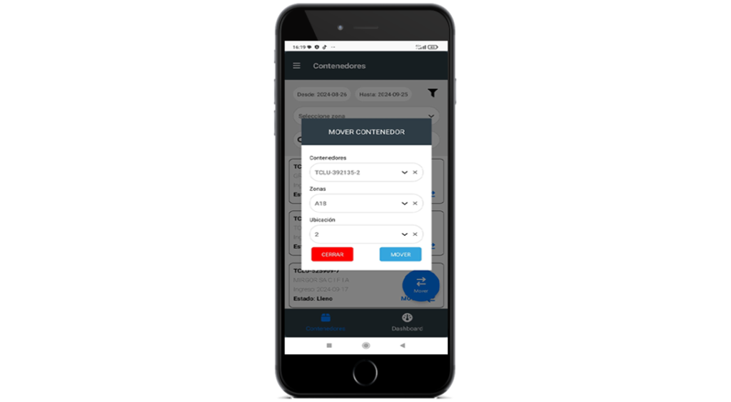 Haciendo click sobre la grilla se abre esta ventana, la que permite generar el movimiento del contenedor hacia otra ubicación.